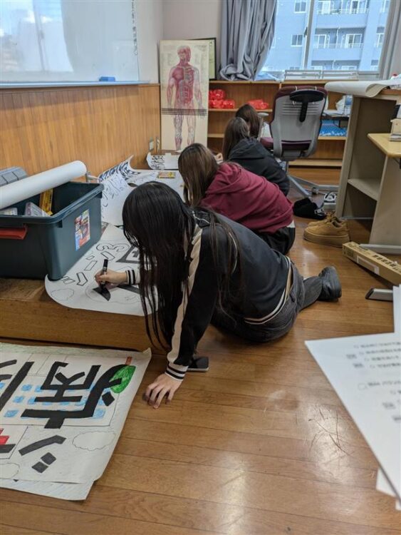 配役の学生はセリフを覚え、大道具の学生は背景の準備に取りかかっています。