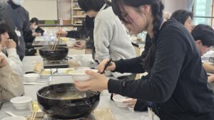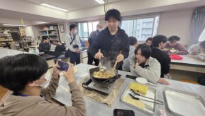 今年度の授業もいよいよラストスパート! 試験の緊張感から解放された1年生たちが、1コマ目の終了後、お昼ごはんを兼ねた「特製鍋パーティー」を楽しみました。