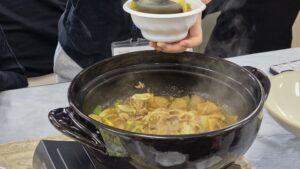 教室に広がるのは、食欲をそそるいい香り。 グループごとに準備した鍋つゆは、海の幸が詰まった「海鮮」、コク深い「味噌」、そしてピリッと刺激的な「チゲ」など、バリエーションも実に豊かです。