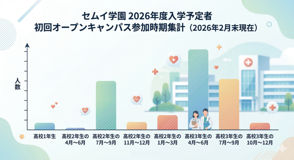まずは、セムイ学園に入学した高校生がいつ頃オープンキャンパスに参加しているのか、その傾向を見てみましょう。