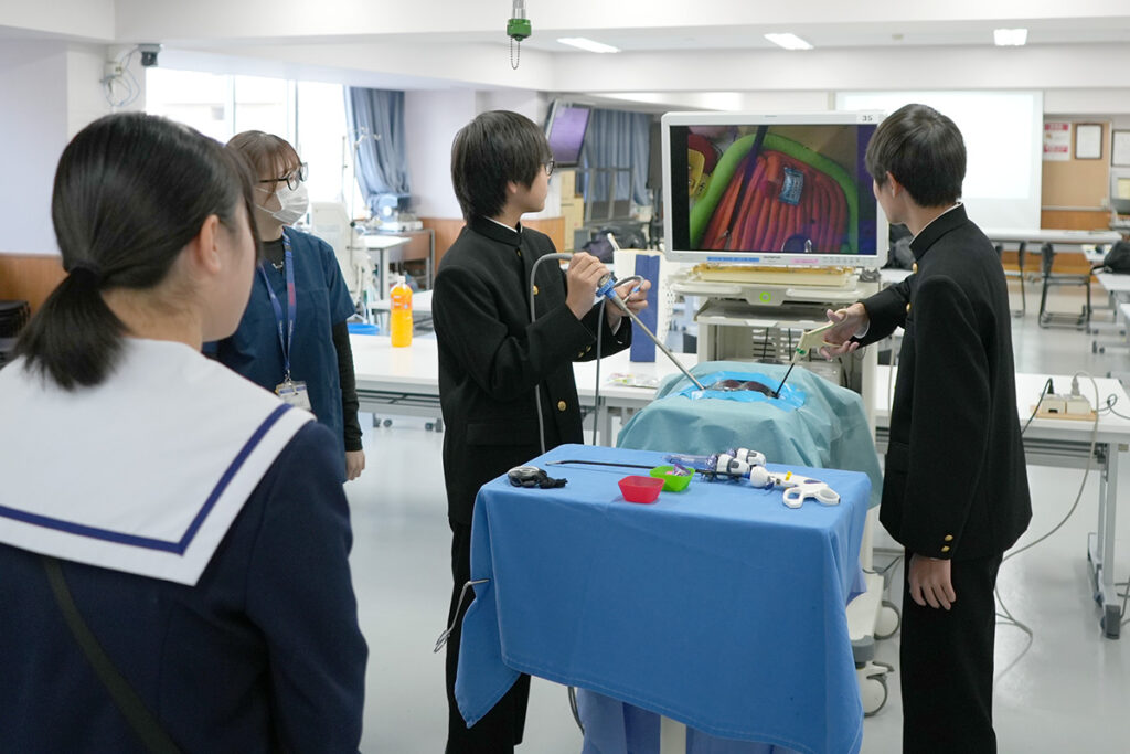 臨床工学科での学びや、チーム医療の紹介や医療機器の専門家である臨床工学技士の仕事を説明した後、透析装置による「ジュースのろ過実験」や「内視鏡操作体験」などを行いました。